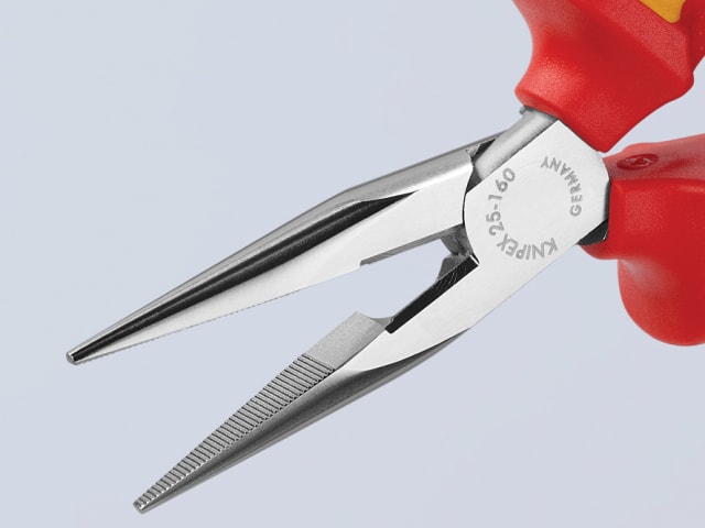 These Knipex 25 06 Series Snipe Nose Cutting Pliers are fitted with multi-component grips, VDE tested up to 10,000V and safe for work up to 1,000V. They conform to DIN EN / IEC 60900. Made from vanadium electric steel, forged, multi stage oil-hardened. Chrome plated finish. Half-round, long, tapered jaws with knurled gripping surfaces. With cutting edges for medium hard and hard wire. The cutting edges are additionally induction hardened, cutting edge hardness approx. 61 HRC.
