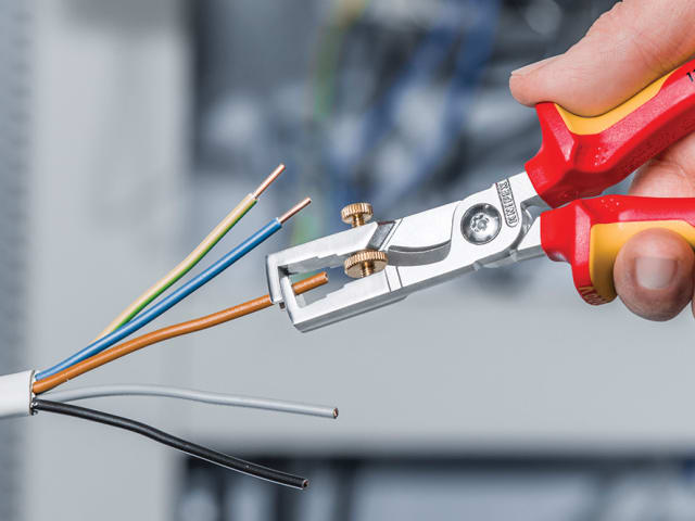 The Knipex 13-6 Series StriX Insulation Stripper with multi-component grips, VDE tested up to 10,000V and safe for work up to 1,000V. They conform to DIN EN / IEC 60900. Made from high-grade tool steel that has been forged and oil-hardened, multiple times. Chrome plated finish. The knurled screw and lock nut provide easy adjustment to the required diameter of solid or stranded wire. Also fitted with a shear blade for cutting copper cable up to 15mm (5 x 2.5mm²) and a bolted joint for precise operation with zero backlash. The pliers have a slim design for easy access.